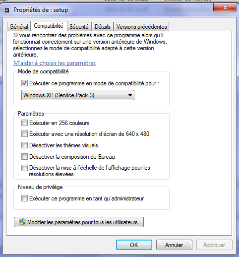 Actuellement, la plupart des machines sont équipées de Windows 7. Pour installer Oracle 10g sous ce système, ce sont les mêmes étapes, sauf que avant de procéder l'installation, vous devez changer le mode de compatibilité dans les propriétés du programme setup d'Oracle en cochant la case Exécuter ce programme en mode de compatibilité.